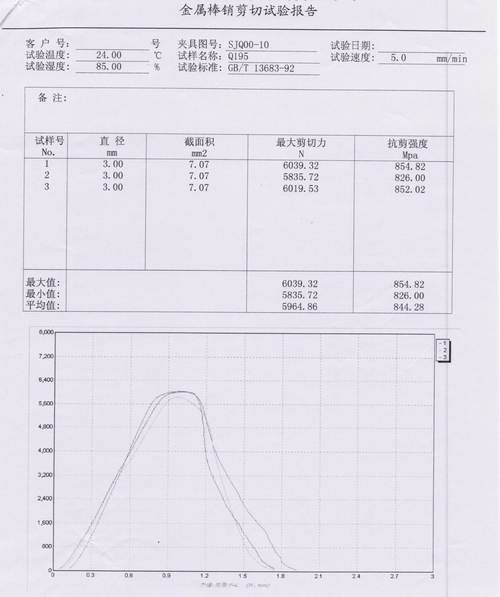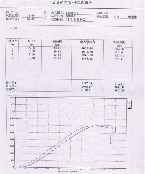 6061鋁金屬棒銷剪切試驗(yàn)報(bào)告內(nèi)容:①直徑 截面積 ②最大剪切力 ③抗剪強(qiáng)度