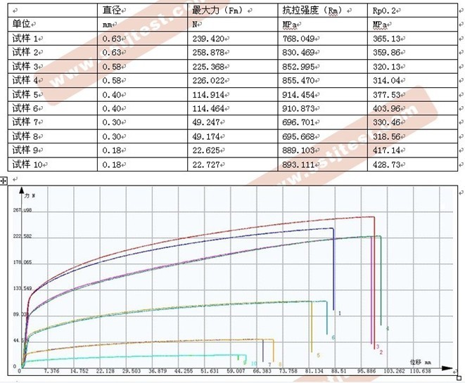 試驗方案:不銹鋼燒結(jié)網(wǎng)鋼絲拉伸試驗方案計算標(biāo)準(zhǔn):GB-T 228-2002試驗設(shè)備:CMT1104試樣形狀:線材材料名稱:鋼絲試驗速度:10 mm/min原始標(biāo)距(Lo):100 mm夾具:鋼絲纏繞濕度:64 %溫度:15 ℃不銹鋼燒結(jié)網(wǎng)鋼絲拉伸試驗報告:
